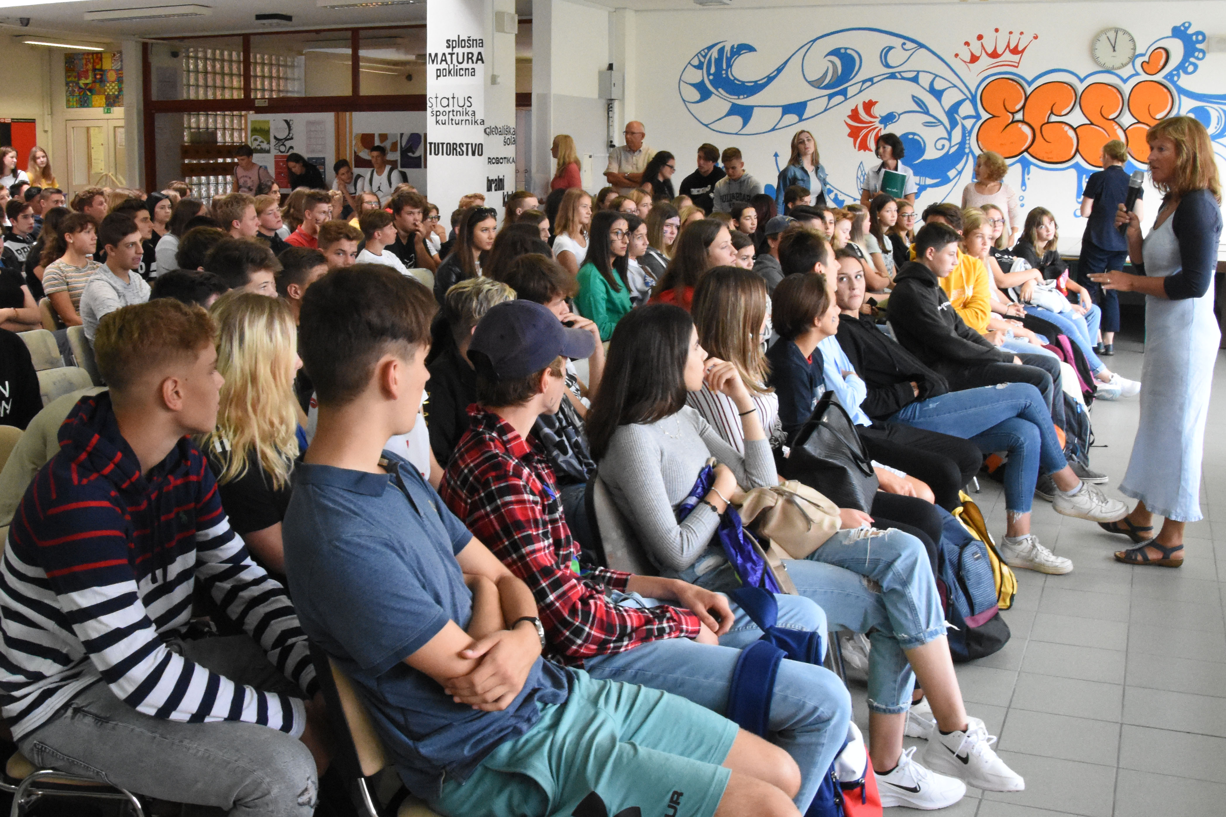 Letos smo na naši šoli sprejeli pet razredov 1. letnikov. Na začetku jih je v avli pozdravila in nagovorila gospa ravnateljica Ksenija Lipovšček. Zanje smo pripravili šolske copate, mapo z različnimi informacijami, prejeli so tudi šolske publikacije. Dijaki 2. letnikov so jim pripravili kratek sprejem, vodili so jih po šoli in pokazali razrede. Skupaj so zrecitirali šolsko himno, narisali šolo, kot si jo oni predstavljajo, in se posladkali s čokolado.